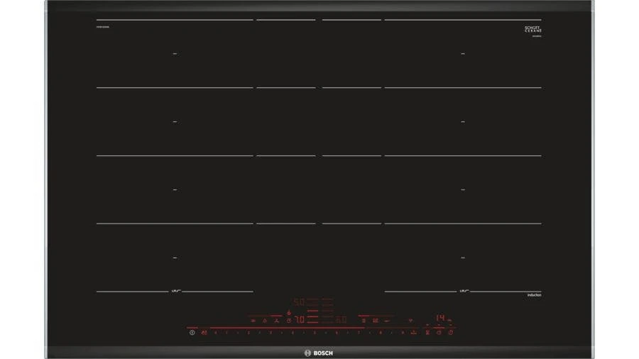 Bosch Serie 4 NXX675CB1E. Produktfarbe: Schwarz, Edelstahl, Geräteplatzierung: Integriert, Kochfeldtyp: Zonen-Induktionskochfeld. Zertifizierung: AENOR, CE. Steuerung: Berührung, Steuerungsposition: Vorne oben, Display-Typ: LED. Anschlusswert (elektrisch): 7200 W, AC Eingangsspannung: 220-240 V, AC Eingangsfrequenz: 50 – 60 Hz. Breite: 606 mm, Tiefe: 527 mm, Höhe: 51 mm